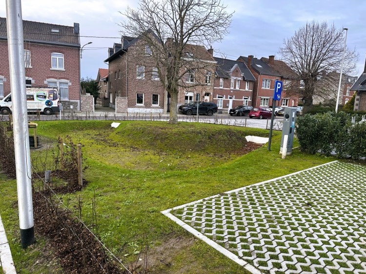 Le bourgmestre et l’échevine des Travaux se réjouissent des modifications apportées à Driesch, où l’es espaces verts et le parking en klinkers faciliteront l’inflitration d’eau…..